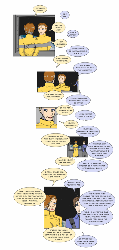 Still on Central. Moving forward, I’m going to use the full black borders for when we are Central, and the white borders for when we are Palindra. Until I forget anyway. I imagine people can probably guess how Mari might[…]↓ Read the rest of this entry…